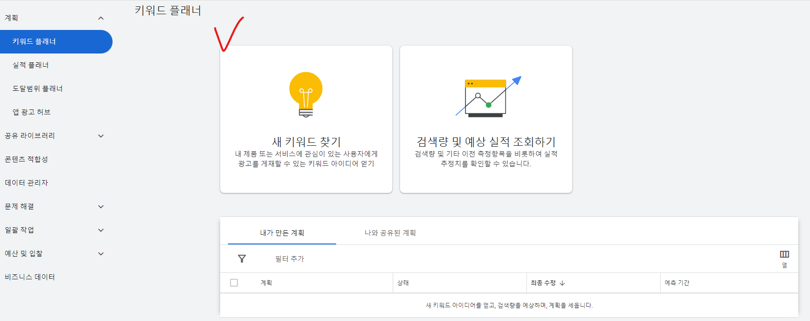 먼저 구글애즈 계정을 만드시고 키워드플래너 결제수단까지 등록하면 위 메인 페이지로 가게 되는데.