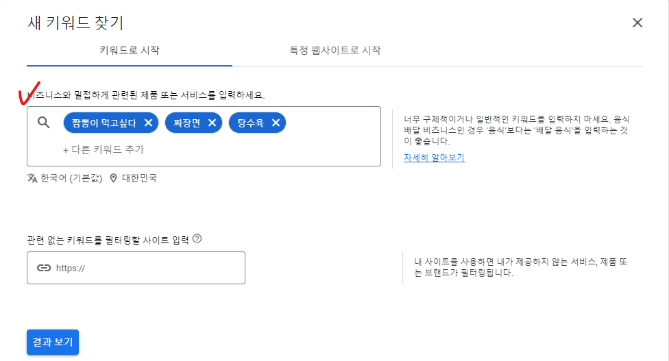 • 2.키워드 아이디어 검색 : 본격적으로 “키워드 찾기”를 클릭하고 특정 키워드나 웹사이트 URL을 입력해주세요.
