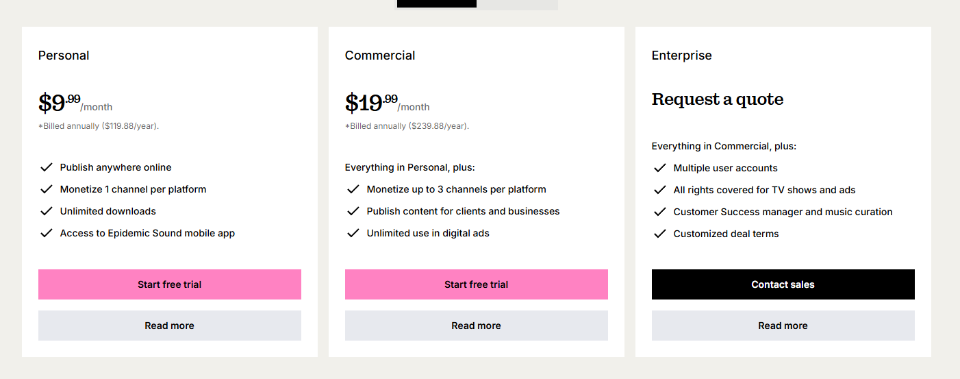 월 결제로 이용 할 수 있는 에피데믹사운드는 아래와 같이 요금제로 구성되어 있는데요.