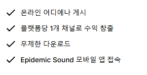 | 온라인 어디에나 게시 가능 플랫폼당 1개 채널로 수익 창출 가능 무제한 다운로드 가능 Epidemic Sound 모바일 앱 접속 | –개인 요금 외 추가되는 사항– 플랫폼당 최대 3개 채널에서 수익 창출 클라이언트와 기업을 위한 콘텐츠 게시 디지털 광고에서 무제한 사용 가능 | 상업용으로 제공되는 모든 것, 그리고 다음이 포함됩니다: 여러 사용자 계정 TV쇼와 광고에 대한 모든 권리는 보호됩니다. 고객 성공 관리자 및 음악 큐레이션 맞춤형 거래 조건 |